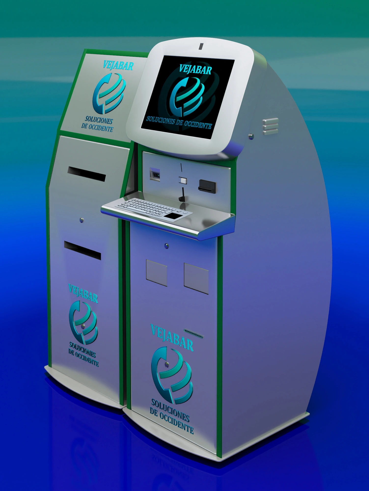 CPU i5, i7, 256 SSD, 8 GB. Teclado, Laser, Validador de Billetes y monedas, dispensador de billetes y monedas, QR/ C. De Barras, lector de Huella.